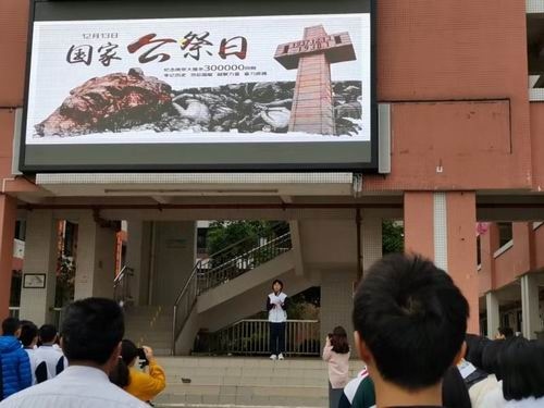 接著鄒進(jìn)輝老師以自己86歲的奶奶為例子,深度講述當(dāng)年與自己奶奶是同齡人的南京人民當(dāng)時的悲慘遭遇,講述了今天大屠殺幸存者在不斷地減少,但我們不能因此而忘記歷史,而是應(yīng)該從南京大屠殺這段悲痛的歷史中吸取經(jīng)驗教訓(xùn),銘記歷史,奮發(fā)圖強,落實家國情懷核心素養(yǎng)教育。最后,警笛鳴起,全校師生共同為南京大屠殺遇難者默哀。
