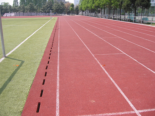 13mm透氣式塑膠跑道鋪設(shè)施工工藝是采用兩步施工法進行鋪設(shè)的。底層黑膠粒層,攤鋪厚度為10-11毫米,將其固化后,在上面再噴涂厚度為2-3毫米的膠粒。