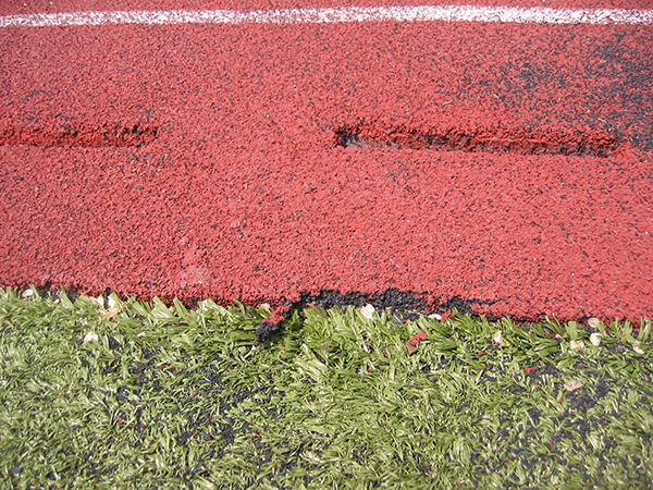 6、鋪設(shè)的底膠成膠后,對全場進行檢查,發(fā)現(xiàn)邊緣不整齊或有凹凸之處,要進行削割、打磨、補膠和修整處理,以保證面膠鋪設(shè)的厚度。