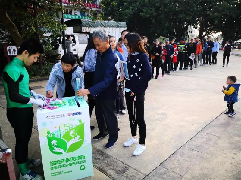 在2017年,深圳體彩還舉行了“循環(huán)閱讀 愛心回爐 2017深圳體彩環(huán)保公益行動(dòng)”,活動(dòng)在人流密集的地鐵站內(nèi)進(jìn)行,由專人引導(dǎo)地鐵乘客對(duì)免費(fèi)領(lǐng)取的報(bào)紙進(jìn)行定點(diǎn)回收,以呼吁市民對(duì)報(bào)紙、書刊等紙質(zhì)讀物進(jìn)行二次回收,實(shí)現(xiàn)循環(huán)閱讀,傳達(dá)“每回收200份報(bào)紙,就能拯救一顆小樹”的環(huán)保理念,共有3000余人領(lǐng)取了體彩制作的“環(huán)保公約卡”。