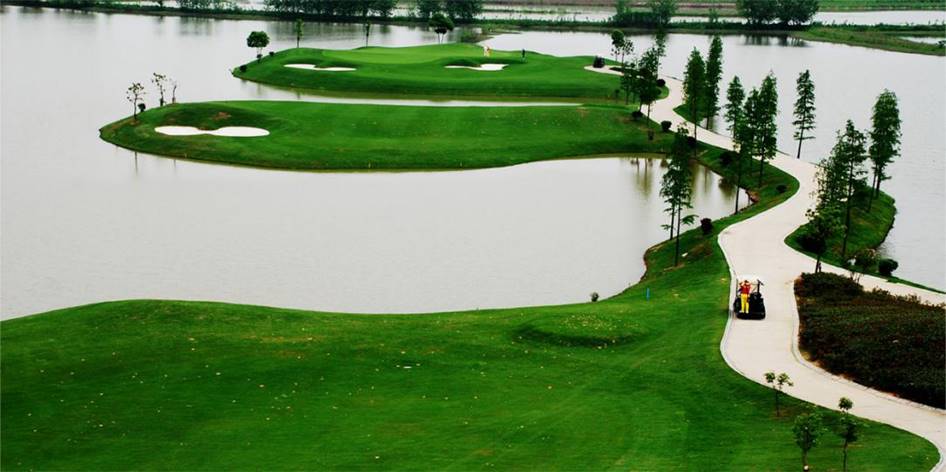 該球場是依據(jù)世界高爾夫職業(yè)比賽(PGA)標(biāo)準(zhǔn)設(shè)計建造的標(biāo)準(zhǔn)桿72桿的18洞高爾夫球場,總占地面積1300畝,水占面積500畝,球道面積800畝,其中沙坑面積14134平方米。每洞至少5個發(fā)球臺,50米高的天然坡度,6個島型果嶺,6個炮臺果嶺,72個沙坑,17個洞有水障礙環(huán)繞……