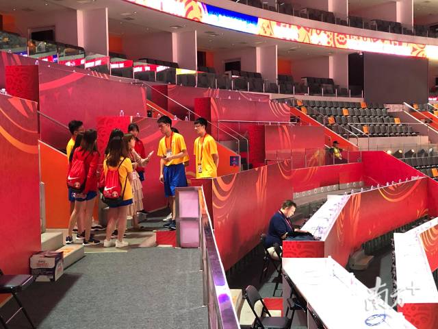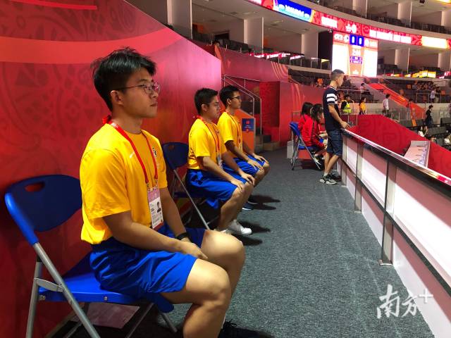 焦急踱步,緊盯著斜右側(cè)的記分臺(tái),只見(jiàn)隊(duì)友跑了過(guò)來(lái),一把接過(guò)比賽數(shù)據(jù),轉(zhuǎn)身,倒計(jì)時(shí)開(kāi)始——這是“小黃人”志愿者與時(shí)間的比賽。
