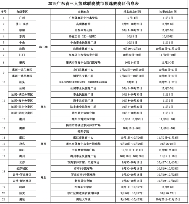 中國體育彩票·2019廣東省3X3籃球聯(lián)賽是一項面向全省草根籃球愛好者的民間草根賽事,具有參與門檻低、包容性強、覆蓋面廣、影響力大的特點,受到廣大百姓的喜愛。自9月全面開啟報名以來,全省各地反響熱烈,報名火爆。截止至10月23日17時,成功報名比賽的隊伍達到720支,其中男子組528支,女子組192支。在賽制方面,本屆比賽分為城市預選賽、44強分站賽、32強分站賽和總決賽四個階段,其中預選賽階段在全省22個分賽區(qū)設(shè)立比賽站點。詳見文末附表。
