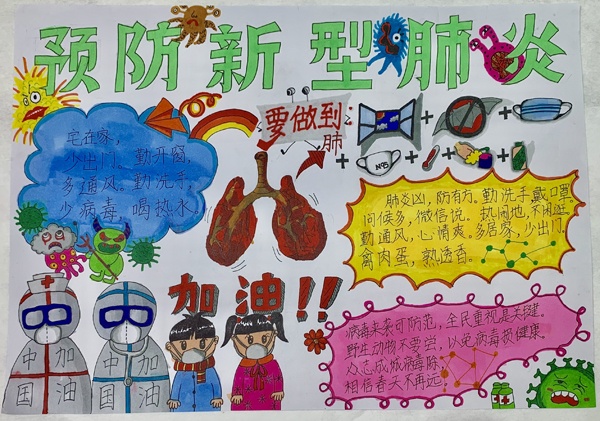 指導(dǎo)學(xué)生健康科學(xué)“抗疫”。一是優(yōu)秀電影“看起來”,根據(jù)學(xué)生年齡特點(diǎn)分別推薦“港珠澳大橋”、“流浪地球”、“烈火英雄”、“奔跑的少年”等30多部優(yōu)秀電影,建議家長陪同孩子一起觀看,在享受視覺盛宴、密切親子關(guān)系的同時,汲取正能量;二是鍛煉身體“動起來”,將《國家體育總局居家鍛煉(全年齡方案)》推介給學(xué)生及家長,要求學(xué)生居家鍛煉每天至少半小時以上;三是家務(wù)勞動“干起來”,要求學(xué)生每天在家做一些力所能及的家務(wù)勞動,比如,做一道菜、掃地、洗碗、疊衣服等;四是“加油”能量“發(fā)出來”,學(xué)校指導(dǎo)少先隊(duì)員在做好自身防護(hù)的同時,在家里通過錄視頻、寫一封信、繪制海報(bào)、等方式,向奮戰(zhàn)在疫情防控一線的先鋒們致敬,為武漢送上“加油”,為中國送上祝福。五心理健康“護(hù)起來”,教育系統(tǒng)精心挑選了14位專業(yè)心理教師、社工,開通熱線電話、微信、QQ等通道,為有需要的師生及家長提供情緒疏導(dǎo)或心理輔導(dǎo),有效預(yù)防、減緩疫情對師生及家長的負(fù)面心理影響。