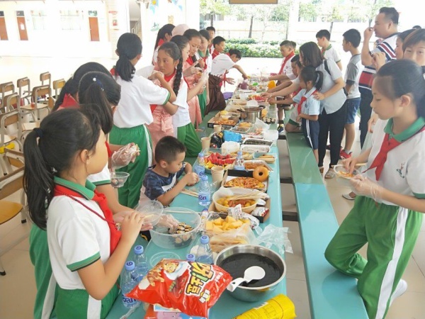 歡樂的同時(shí)怎么能少得了美食?;顒?dòng)現(xiàn)場,中心小學(xué)的家長們?yōu)檫h(yuǎn)方的朋友送上了各種美味家鄉(xiāng)小吃:金黃的煎堆、色香味俱全的腸子魚蛋、款式各異的馬蹄糕、清熱解毒的涼粉、風(fēng)味十足的芋頭糕……孩子們你一塊,我一塊,美美地品嘗起來,其樂融融。