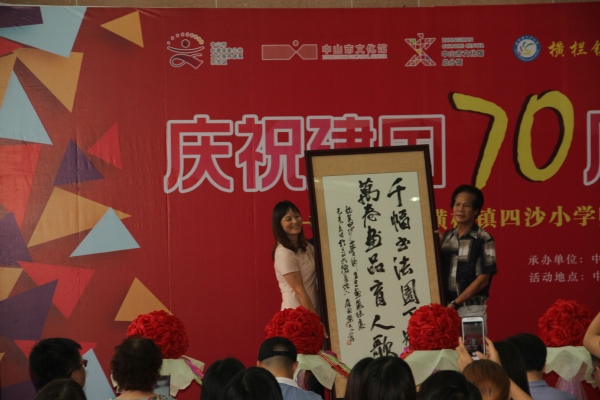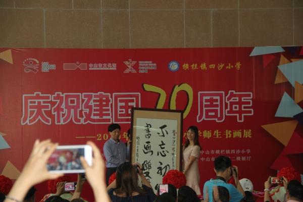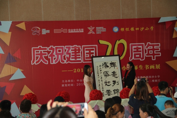 兩位領(lǐng)導(dǎo)的講話為書畫展的開幕增色添香。接著,舉行了書畫贈(zèng)送儀式。在熱烈的掌聲中,“書壇新秀,畫藝蓓蕾”、“不忘初心,德藝雙馨”、“千幅書畫園丁贊,萬卷畫品育人歌”和“揮毫列錦繡,落紙如云煙”等四幅書法精品分別被贈(zèng)予中山市文化館和四沙小學(xué)。緊接著各級(jí)領(lǐng)導(dǎo)上臺(tái)進(jìn)行了剪彩。在熱情奔放的音樂聲和熱烈的掌聲中,禮花綻放——四沙小學(xué)慶祝建國(guó)70周年師生書畫展正式開幕!