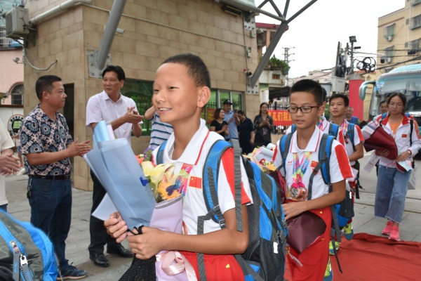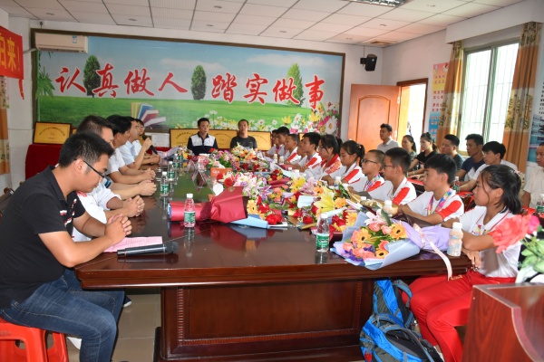 7月29日,華文學(xué)校跳繩隊(duì)教練和運(yùn)動(dòng)員們載譽(yù)而歸,橫欄鎮(zhèn)教育事務(wù)指導(dǎo)中心霍嘉俊主任、華文學(xué)校董事梁耀新、祝和群先生、華文學(xué)校謝春生校長(zhǎng)以及運(yùn)動(dòng)員家長(zhǎng)等人到學(xué)校門口迎接他們的歸來(lái),并在學(xué)校會(huì)議室舉行了座談會(huì)。