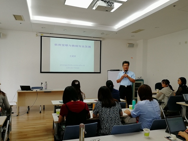 8月24日上午,華東師范大學(xué)教育學(xué)部教育系副教授王建軍以《學(xué)校變革背景下的教師專業(yè)發(fā)展》為題拉開了上午講座的帷幕。王教授從當(dāng)代教師為何需要謀求持續(xù)專業(yè)發(fā)展,當(dāng)今教師需要什么的專業(yè)素養(yǎng)及如何提高專業(yè)發(fā)展的實(shí)效這三個方面剖析教育變革與教師專業(yè)發(fā)展方向。王教授指出:與古代和近代的教育相比,現(xiàn)在的教育發(fā)生了很大的變化,社會與教育發(fā)展對教師及其素養(yǎng)提出了新要求,教師要利用現(xiàn)有專業(yè)發(fā)展途徑,促進(jìn)有效的個人發(fā)展,唯有如此,這樣才能跟上改革的步伐。王教授風(fēng)趣的語言,加上形象生動的類比,讓學(xué)員們興趣盎然,使學(xué)員們對自己的專業(yè)發(fā)展有了更深層的理解和思考。