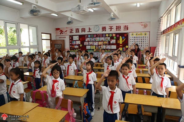 10月14日早上,中山市石岐中心小學(xué)升旗儀式上,少工委副輔導(dǎo)員袁海紅老師為全體輔導(dǎo)員向少先隊員們宣讀了“習(xí)近平總書記致中國少年先鋒隊建隊70周年的賀信”,希望隊員們謹(jǐn)記教誨,“從小學(xué)先鋒、長大做先鋒”,聽黨的話、跟黨走,“讓紅領(lǐng)巾更加鮮艷”!
