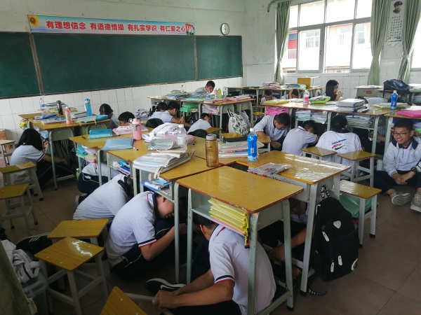 隨著警報聲響起,各班的學生在班主任的組織下,迅速而有序地出教室門口,快速地走下樓梯,往指定的避險區(qū)域跑去,到了避險地點后,體育委員立即整理隊伍,向演練指揮部報告人數(shù)。整個過程僅用了幾分鐘。