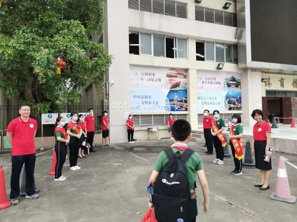 清晨的校園,空氣清新,知了聲聲。在這個(gè)特別的復(fù)學(xué)季,孩子們邁著輕盈的步伐,朝著五桂山學(xué)校的方向走去。孩子們胸前鮮艷的紅領(lǐng)巾隨風(fēng)飄揚(yáng),清澈的眼眸中蕩漾著滿(mǎn)滿(mǎn)的笑意。學(xué)校全體行政和值日教師早早分列在學(xué)校大門(mén)口和體育館門(mén)口,滿(mǎn)臉笑容,等待孩子們的歸來(lái)。五桂山派出所的民警、家委護(hù)衛(wèi)隊(duì)、禮儀小天使也做好準(zhǔn)備,等待孩子們的返校。在小天使的引導(dǎo)下,復(fù)學(xué)的孩子們沿著學(xué)校規(guī)定路線,按前后間隔一米的要求,有序地通過(guò)體溫測(cè)試后進(jìn)入校園。