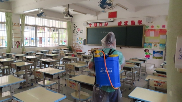 是日下午3:30分,演練開始。第一個預設場景是健康檢查演練。模擬學校開學后,在校門體溫監(jiān)測點發(fā)現(xiàn)某學生體溫異常。值班行政經過再次體溫檢測確認體溫異常,按要求詢問該學生,確定學生有與境外疫情重點地區(qū)人員接觸史時,立刻引導學生進入臨時隔離室并聯(lián)系校醫(yī)室、班主任。學校醫(yī)務人員到場后,再次詢問學生的“三史”,并用水銀體溫計對學生測量體溫。再次確定學生體溫異常后,醫(yī)務人員立即撥打120通知相關醫(yī)院派車接診并上報屬地疾控中心。與此同時,醫(yī)務人員把情況匯報給學校負責人,并上報區(qū)教指中心。專業(yè)消毒人員最后對相關區(qū)域進行消毒。