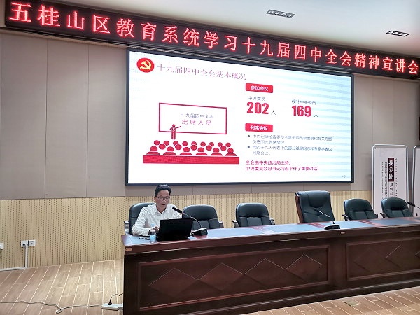 2019年12月13日下午,五桂山教育系統(tǒng)召開(kāi)學(xué)習(xí)十九屆四中全會(huì)精神宣講會(huì),主講人為五桂山區(qū)宣講團(tuán)成員黃學(xué)富主任。五桂山教育事務(wù)指導(dǎo)中心張立功主任及成員、五桂山學(xué)校全體教師、五桂山中心幼兒園教師參加了本次宣講會(huì)。