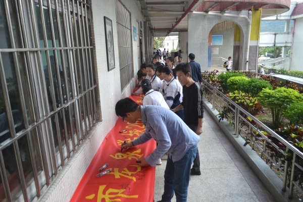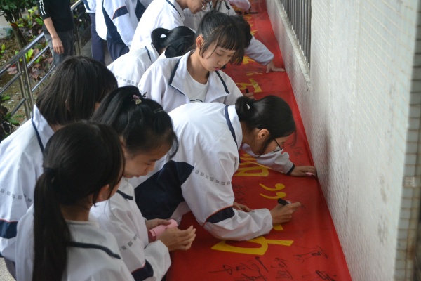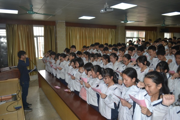 激動人心的時刻來了,九年級全體教師走上臺前,魏賽彬老師率領同學們宣誓和簽名。同學們喊出擲地有聲的誓言,抒發(fā)勇于拼搏,敢于挑戰(zhàn)的勇氣和豪情,堅定了必勝的信念,激發(fā)了催人奮進的斗志,把誓師大會推向高潮。?