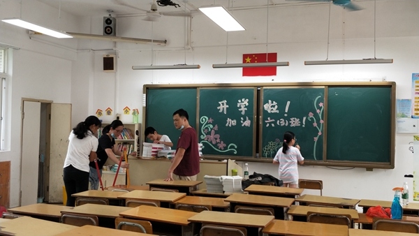 清潔完教室,老師們帶著親子義工前往學(xué)校圖書館領(lǐng)取書籍。老師們將書籍歸置好后,家長們和孩子接力將圖書館的書籍搬回教室,進(jìn)行書籍分類,并將書籍分發(fā)到每位同學(xué)的桌上,細(xì)心地整理......很快,一摞摞整齊的書籍平整地放在干凈的桌面上,等待著同學(xué)們的歸來。不知不覺已經(jīng)過去了一個多小時,教室外陽光熾熱,教室里熱情洋溢, 一張張勞動中的臉紅撲撲的,伴著笑容在校園里格外美麗。
