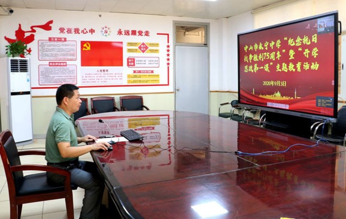2020年9月3日,是中國人民抗日戰(zhàn)爭勝利75周年紀念日,也是值得每個中國人銘記的日子!8點40分,中山市永寧中學全體師生在各班教室舉行“紀念抗戰(zhàn)勝利75周年”主題校會。學校使用釘釘群進行線上直播,楊青華副校長主持。