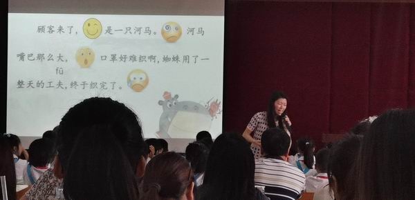 下午2點(diǎn)15分,主持人用謙虛的語言拉開了活動(dòng)的序幕。小欖鎮(zhèn)績東一小學(xué)的袁曉儀老師為大家提供了一個(gè)很好的課例,她上課的題目是《蜘蛛開店》。袁老師由變魔術(shù),玩小游戲開始導(dǎo)入課堂,讓孩子們很快進(jìn)入狀態(tài),快樂學(xué)習(xí)!接著袁老師讓孩子們自由學(xué)習(xí)朗讀課文,認(rèn)讀生字,理解重點(diǎn)詞句,由淺入深,循序漸進(jìn)。最后,袁老師讓孩子們根據(jù)黑板上提煉的關(guān)鍵詞語來復(fù)述課文,孩子們繪聲繪色地講《蜘蛛開店》的故事,贏得了現(xiàn)場老師的陣陣掌聲!
