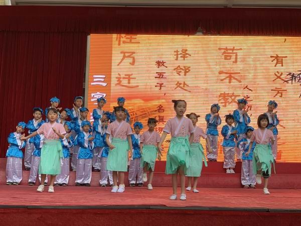 “人之初,性本善。性相近,習(xí)相遠(yuǎn)?!迸_上在以歌舞形式向師生傳頌《三字經(jīng)》的同學(xué)個個穿戴整齊,男生是古時儒生打扮,正搖頭吟唱,聲情并茂,女生身穿襦裙翩翩起舞,輕盈如燕,朗朗書聲和優(yōu)美舞姿生動地展示了《三經(jīng)字》的精髓所在、文化內(nèi)涵。