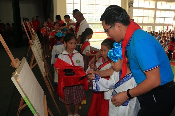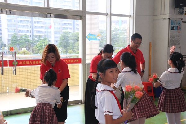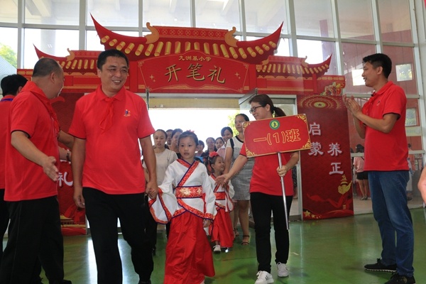 開筆破蒙禮 最美師生情 九月的陽光格外燦爛,九月的天空分外明媚,9月10日,在我國第35個教師節(jié)這個特殊的日子里,九洲基小學(xué)全體師生和一年級新生的家長歡聚在學(xué)校體育館,舉行了一年級開筆禮暨教師節(jié)慶祝活動。此次活動還邀請到小欖鎮(zhèn)教育事務(wù)指導(dǎo)中心副主任鄧永飛先生;九洲基社區(qū)黨委委員、居委會副主任伍枝發(fā)先生;九洲基社區(qū)黨委委員、治保會會主任李泳堅先生;九洲基小學(xué)家委會會長胡來輝先生;九洲基小學(xué)家委會副會長張宗剛先生以及九洲基小學(xué)校長艾斌先生。 在嘹亮的國歌聲中,鮮艷的五星紅旗映紅了一張張朝氣蓬勃的笑臉,隆重的一年級新生開筆禮正式舉行?!伴_筆禮破蒙儀式”是九洲基小學(xué)舉行的 “弘揚民族文化,傳承中華美德”的常規(guī)舉措,目的是使一年級新生以及全體同學(xué)們沐浴國學(xué)智慧,追尋文化根源,啟動人生第一件大事。 開筆禮的第一個環(huán)節(jié)是正衣冠。梁雪芬老師帶領(lǐng)全體同學(xué)齊聲誦讀《三字經(jīng)》片段:面必凈,發(fā)必理,衣必整,紐必結(jié)。頭容正,肩容平,胸容寬,背容直。九洲基小學(xué)行政以及領(lǐng)導(dǎo)嘉賓為學(xué)生代表整理服裝,一年級班主任和科任老師為學(xué)生整理服裝。 接下來開筆儀式第二項是朱砂啟智。朱砂啟痣,就是請領(lǐng)導(dǎo)、老師用紅色的朱砂在同學(xué)們的額頭正中點上紅痣,又稱“開天眼”。代表著開啟智慧,以此寄托美好的愿望。 第三環(huán)節(jié)是啟蒙描紅。王湛春老師現(xiàn)場示范一尺見方楷體“人”字。講解寫字要求做到八個字:頭正、身直、臂開、足安。各班代表拿筆、蘸墨,描寫出一個人字。由老師手把手地指導(dǎo)學(xué)生開筆。臺下其它同學(xué)在老師的指導(dǎo)下左手當(dāng)小黑板,右手食指當(dāng)筆進行書空。 第四環(huán)節(jié)贈書送禮。校領(lǐng)導(dǎo)為新生贈送該校自編的德育校本教材《好習(xí)慣伴我成長》,人手一冊。 接著學(xué)生代表講話和黃景鋒副校長寄語,希望一年級同學(xué)學(xué)習(xí)有個良好開端,希望全體同學(xué)新學(xué)期都更上一層樓。最后開筆禮在大家的掌聲中禮成! 活動第二環(huán)節(jié)是“最美師生情”教師節(jié)慶?;顒印W(xué)生們先通過觀看一段沙畫視頻,了解了老師們的良苦用心,接著師生同臺深情朗誦《感謝您,辛勤的園丁》,緊接著合唱團的一曲《每當(dāng)走過老師窗前》將慶祝活動推向高潮孩子們對老師的感激與愛戴之情都融入朗誦和歌聲中…… 學(xué)生代表為敬愛的老師獻上一束鮮花,道上一聲“節(jié)日快樂”,嬌艷的花瓣映襯著老師的笑臉,映襯著學(xué)生的微笑,人比花兒俏。 最后是代表發(fā)言。從學(xué)生代表發(fā)言中大家感受到學(xué)生對老師的愛,不僅在那嬌艷的鮮花里,更在認真守紀的課堂,響亮動聽的讀書聲,整潔漂亮的作業(yè)等實際行動中;從教師代表司徒詠老師的發(fā)言中大家感受到了九小年輕教師的成長離不開前輩們的關(guān)愛,離不開學(xué)生們的支持,更離不開老師自身的努力;從艾斌校長的發(fā)言中大家感受到了在學(xué)校尊重教育理念引領(lǐng)下,學(xué)生們健康快樂成長,老師們職業(yè)幸福感越來越濃,九洲基小學(xué)的發(fā)展蒸蒸日上!