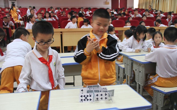 各參賽隊(duì)伍在了解比賽規(guī)則了之后,比賽就開(kāi)始了。一年級(jí)的小朋友們各施其技,搭出各種各樣形狀的紙牌,然后再小心翼翼地把書本放在搭好的紙牌上。但是有些隊(duì)伍在放書本的時(shí)候,不小心把搭好的紙牌推到了,必須要從頭再來(lái),可小朋友們也沒(méi)有氣餒,更是同心協(xié)力地繼續(xù)比賽。而看臺(tái)的同學(xué)則屏住呼吸,生怕發(fā)出一點(diǎn)點(diǎn)聲音就會(huì)讓賽場(chǎng)上的紙牌倒掉。比賽的最后,一(2)班的C組參賽隊(duì)伍以在紙牌上放上了18本書的成績(jī)勝出比賽。