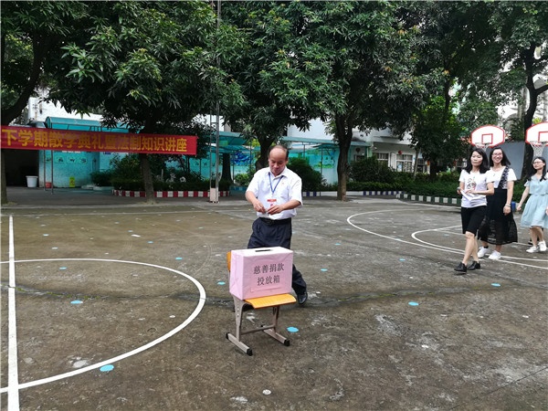 散學(xué)典禮最后的環(huán)節(jié)是響應(yīng)“廣東扶貧濟(jì)困日活動(dòng)”,組織全體師生進(jìn)行愛(ài)心捐款活動(dòng)。一張張承載著老師們和同學(xué)們愛(ài)心的錢(qián)幣被投放到捐款箱里,捐款箱笑了,老師們和同學(xué)們也笑了。