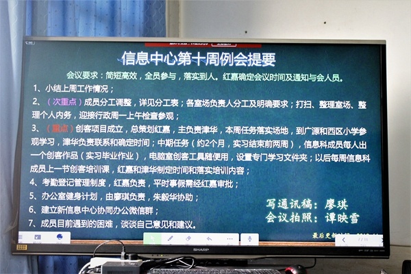 陳倫主任首先宣讀了本學(xué)期接下來(lái)兩個(gè)月的工作計(jì)劃,針對(duì)目前科組面臨的各個(gè)問(wèn)題以及學(xué)校領(lǐng)導(dǎo)期望提出了相應(yīng)的解決方案并對(duì)科組各個(gè)成員負(fù)責(zé)的區(qū)域進(jìn)行詳細(xì)劃分和明確分工。陳主任著重強(qiáng)調(diào)了科組未來(lái)兩個(gè)月的工作重心:一、要大力推廣微檢修平臺(tái)的規(guī)范使用。二、明確指出若需信息科提供技術(shù)及活動(dòng)支持需填寫活動(dòng)申請(qǐng)表來(lái)申請(qǐng)以及對(duì)信息中心服務(wù)支持項(xiàng)目和支持原則進(jìn)行了詳細(xì)解讀。三、創(chuàng)客項(xiàng)目的啟動(dòng),科組各成員將在黃紅嘉科組長(zhǎng)的帶領(lǐng)下學(xué)習(xí)創(chuàng)客知識(shí),讓項(xiàng)目上一個(gè)臺(tái)階,從而推動(dòng)信息科組工作發(fā)展。四、完善科組相關(guān)制度,著重強(qiáng)調(diào)教師信息技術(shù)的提高,以課題促教,規(guī)范管理,科學(xué)教學(xué)。最后麥校長(zhǎng)總結(jié)強(qiáng)調(diào)了目前科組遇到的問(wèn)題,并再三強(qiáng)調(diào)要重在實(shí)踐,絕不紙上談兵。同時(shí)也希望大家解放思想,凝心聚力,尋根問(wèn)源,在原來(lái)發(fā)展基礎(chǔ)上固本強(qiáng)基,找準(zhǔn)問(wèn)題,解決問(wèn)題,緊跟學(xué)校思想與步調(diào)為科組的進(jìn)步而奮斗!