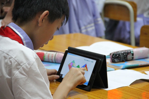 接著,由小欖鎮(zhèn)永康小學(xué)“智慧課堂”實(shí)驗(yàn)班的郭駿濤老師與五(5)班的孩子們呈現(xiàn)了一節(jié)精彩的信息技術(shù)助力的數(shù)學(xué)課——《玩轉(zhuǎn)七巧板》。整節(jié)課以“研學(xué)后教”理念為指導(dǎo)思想,在教學(xué)設(shè)計(jì)中大膽創(chuàng)新,充分發(fā)揮新媒體技術(shù)的優(yōu)勢(shì)作用在課前的學(xué)情調(diào)查、課中的助力、課后的鞏固。課前在線研學(xué)及時(shí)了解學(xué)生學(xué)習(xí)情況,并通過合作探究、作品共享等多種學(xué)習(xí)方式讓學(xué)生充分學(xué)習(xí)和感悟。課堂中,郭老師讓學(xué)生利用平板的錄屏等功能記錄圖形的運(yùn)動(dòng),并上傳和展示,體會(huì)到解決問題的多樣化,發(fā)展了學(xué)生的空間想象能力。課堂中,郭老師充分利用設(shè)備系統(tǒng)讓學(xué)生互相觀看、學(xué)習(xí)同學(xué)的作品,并進(jìn)行點(diǎn)贊、點(diǎn)評(píng)等活動(dòng),充分調(diào)動(dòng)學(xué)生全情參與課堂,整節(jié)課學(xué)生積極參與、樂趣無窮,既學(xué)習(xí)到了知識(shí),也收獲到了學(xué)習(xí)的快樂。課后永康小學(xué)的數(shù)學(xué)科組長(zhǎng)林瑜紅老師就從如何借助信息技術(shù)來及時(shí)了解學(xué)情,巧用學(xué)具,再現(xiàn)運(yùn)動(dòng)過程,達(dá)到發(fā)展學(xué)生空間觀念,培養(yǎng)學(xué)生的語言表達(dá)能力等方面簡(jiǎn)明扼要地介紹了此課的教學(xué)設(shè)想,得到與會(huì)領(lǐng)導(dǎo)、嘉賓、老師的一致贊同。