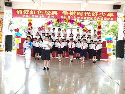 5月31日上午,北區(qū)小學(xué)以“誦讀紅色經(jīng)典,爭做時代好隊員”為主題的經(jīng)典誦讀比賽在北區(qū)小學(xué)大堂如期舉行。北區(qū)社區(qū)治保會施志光主任、北區(qū)小學(xué)黃衛(wèi)紅校長、曾春紅副校長、校家委會代表及全體師生出席了本次活動。