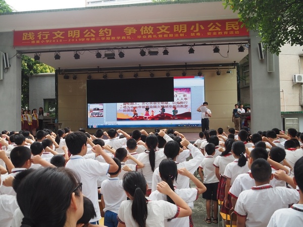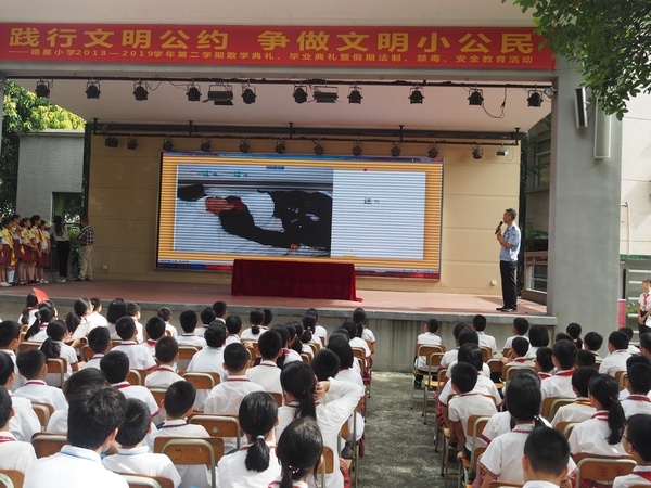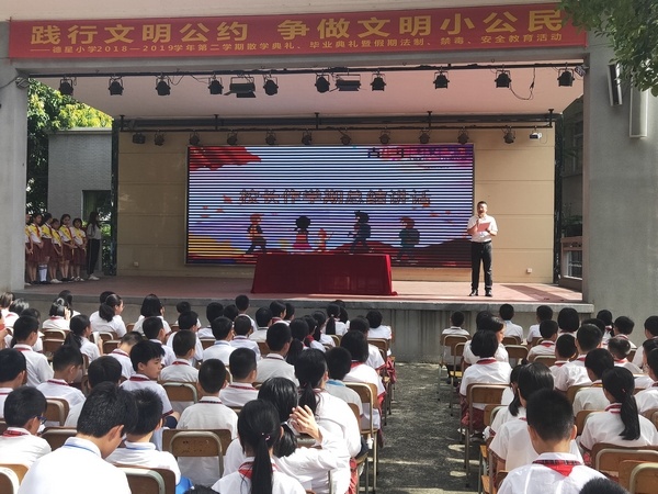為大力培育和踐行社會主義核心價值觀,深化全國文明城市和文明校園創(chuàng)建,中山市教育和體育局在中小學(xué)生中組織開展《中山市民文明公約》宣傳教育實踐活動,通過“小手拉大手,文明齊步走”的方式,促使廣大市民對文明公約普遍認(rèn)知認(rèn)同,做到內(nèi)化于心、外化于行,進(jìn)一步提升社會文明程度。2019年7月5日德星小學(xué)開展了“踐行文明公約,爭做文明小公民”主題教育活動暨散學(xué)典禮、畢業(yè)典禮、假期法制、禁毒安全教育活動。