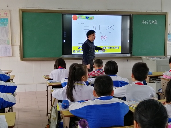 在教學(xué)平行與垂直時,劉主任能根據(jù)學(xué)生的思維特點,借助直觀圖形,充分讓學(xué)生動手操作,同伴互動獲取新知。學(xué)生積極主動參與,人人動手動腦,能過觀察、比較、討論,在輕松愉快的教學(xué)環(huán)境中很快認(rèn)識了兩條直線的位置關(guān)系,分出相交和不相交兩類,平行和垂直的定義。整節(jié)課教學(xué)思路清晰,重點突出,難點也得到了有效的突破,課堂教學(xué)效果好。