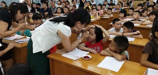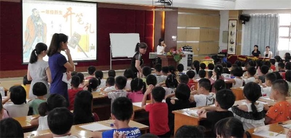 “咚!咚!咚!”,活動以三下洪亮的鼓聲拉開序幕。“朱砂啟智”環(huán)節(jié),由學(xué)校行政代表和班任老師用紅色的朱砂在學(xué)子們的額頭正中點上紅痣,并說上祝福的話語?!爸焐皢⒅恰庇址Q“開天眼”?!梆搿蓖ā爸恰?,意為開啟智慧,以此寄托美好的愿望,從此眼明心亮。接著,中國書法協(xié)會會員謝老師飽含熱情地指導(dǎo)孩子們書寫“人”字,希望孩子們在人生的啟蒙階段學(xué)會做人,知道做人首先要堂堂正正地立身,腳踏實地做事,要像“人”字那樣頂天立地?!百浌P寄語”環(huán)節(jié)上,蔡校長熱情洋溢發(fā)表寄語,希望學(xué)子們尊師孝親、博愛樂學(xué),親圣賢、親師長、成為博學(xué)、健美、善思的好少年。緊接著,在集體誦讀弟子規(guī)環(huán)節(jié)中,稚嫩的童聲響徹活動現(xiàn)場。在學(xué)生代表擊響大鼓后,孩子們都默默地在心中說出了自己的理想和志向。