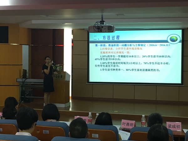 會上首先由課題主持人小欖鎮(zhèn)績東二小學何小玲主任進行結(jié)題報告,全方面地展示了課題組三年來的成果,課題組成員努力探索的學?;趩卧黝}閱讀的小學生閱讀能力培養(yǎng)的模式和目標,力求激發(fā)學生學習興趣,促進小學生閱讀能力的培養(yǎng)。