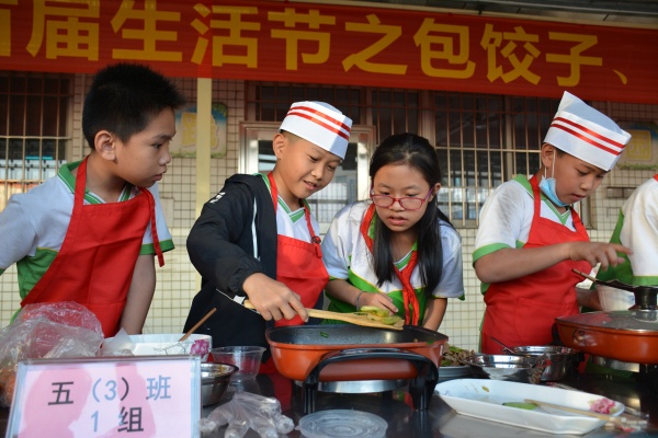 比賽之前,在全校進行宣傳動員,讓每個孩子都動起來,在班級進行初賽。最后班級選出三名選手參加決賽。這次的比賽項目分為:一到三年級穿衣服、系紅領(lǐng)巾、系鞋帶、整理書包、疊衣服;四年級包餃子;高年級廚藝大比拼。參加決賽的學生動作嫻熟,過程流暢,可見平時訓練有素。比賽場面緊張有趣,觀戰(zhàn)的同學情緒高昂,加油聲不絕于耳,整個活動讓孩子們感受到了成長的快樂。