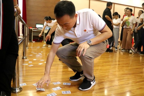 團康活動一開始,陳云炫老師指導40多位參與的老師圍成一個大圓圈,讓大家來了一場“大風吹小風吹”的熱身活動,熱身活動中大家反應敏捷動作迅速,在歡聲笑語中很快融入了活動氛圍。心理老師還為大家準備了小禮品“減壓小貼士”,在“生日蛋糕”的活動中老師們感觸很深,每位老師不分彼此,心連著心,真誠地為對方捶捶背,揉揉肩,拍拍后腦勺鼓勵下對方。在“為你打call”環(huán)節(jié)中,老師們根據自己所報的數字分成了四組,老師們在規(guī)定的時間內為自己的小組取了別致又幽默的名字和口號:陳清茂校長、鐘斌等老師所在的第一組為“天地壹號”組,楊青華副校長、楊建雄老師、楊理明老師等第二小組為“三楊開泰”組,許欽華、黃慧芳等第三組老師為“山竹與榴蓮”組,劉偉、李濤老師帶領的第四小組為“美女與野獸”組。在“撲克牌”游戲中每個小組的成員在討論的過程中匯聚智慧,為小組獻計獻策,出心出力,團結友愛,和睦溫馨的畫面映入眼簾,為家園永中、美麗永中點贊!