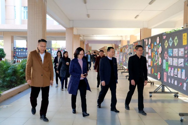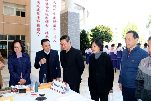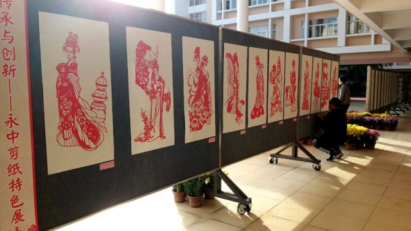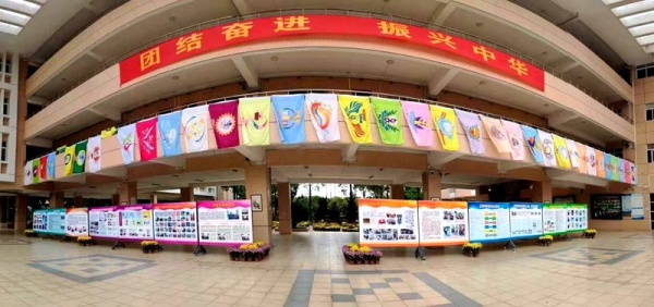 永寧中學(xué)教學(xué)樓一樓風(fēng)雨長(zhǎng)廊人群比肩接踵,絡(luò)繹不絕。這里陳列著“永寧中學(xué)教育教學(xué)成果”展板,“團(tuán)隊(duì)建設(shè)與科組文化”、“永中特色剪紙”、“軟筆書(shū)法展示”、“電腦繪畫(huà)”等展示板前吸引著賓客們駐足觀賞。熱轉(zhuǎn)印杯藝,目不暇接;眼花繚亂的飛旋魔方,讓人拍手叫絕;語(yǔ)文組抑揚(yáng)頓挫、鏗鏘悅耳的朗誦,讓人贊嘆不已……