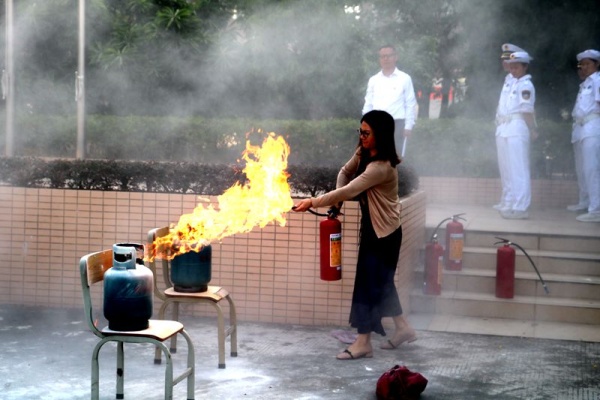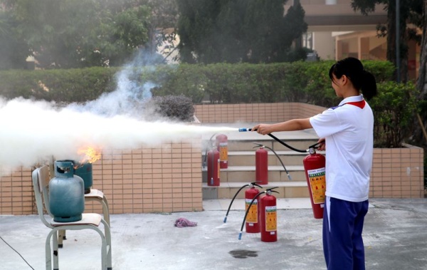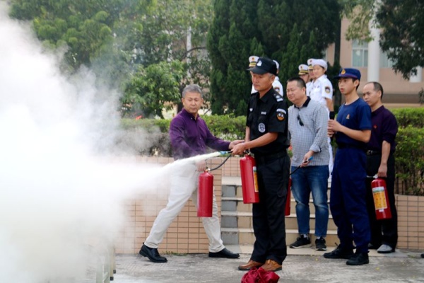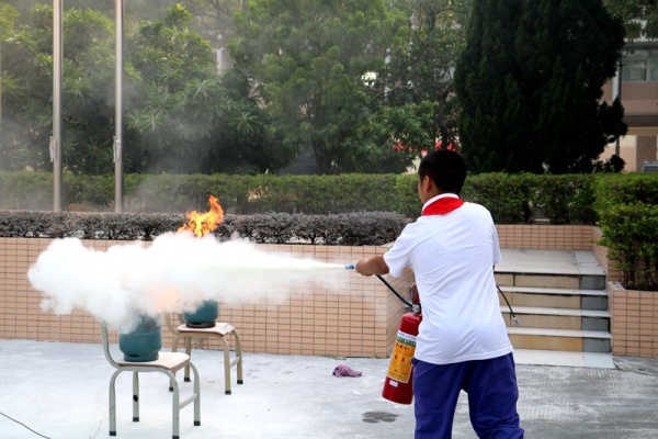 隨后,模擬學校出現(xiàn)火情,小欖鎮(zhèn)消防中隊消防車進入現(xiàn)場,實施撲救的現(xiàn)場實操。消防中隊官兵現(xiàn)場進行有關(guān)滅火器使用及滅火技能培訓,指導教職工、保安及學生模擬實操演練。