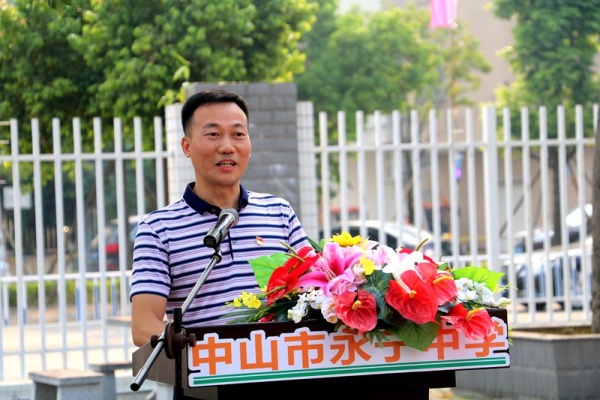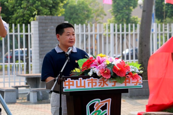 在楊副校長的主持下,章偉志校友、鄧永飛副主任、布寶文委員、陳清茂校長共同為中山市永寧中學(xué)“偉志苑”揭幕,將活動推向高潮。章偉志校友在隨后的講話中回憶自己在永寧中學(xué)的青蔥歲月,感慨良多。建設(shè)“偉志苑”的初衷就是讓永中學(xué)生的安全得到保障,實現(xiàn)人車分流,讓學(xué)校的環(huán)境更加優(yōu)美,硬件設(shè)施更加完善。“偉志苑”的幾棵大樹,有他對母校和學(xué)子們的祝福和寄托。一棵樹木的長成,離不開澆灌,正如學(xué)子們也離不開老師的辛勤付出和教育。章偉志校友愿母校能和大樹一樣,生生不息,桃李滿園,殷切希望學(xué)弟學(xué)妹們以孔子的人格為標(biāo)尺,以學(xué)修身,為國修業(yè),穩(wěn)穩(wěn)地走向更高的知識殿堂,以優(yōu)異成績報答母校。接著,初一9班的黃安琦同學(xué)代表全體永中學(xué)子向校友、領(lǐng)導(dǎo)和老師們鄭重承諾,一定會發(fā)揚永中的“博愛之心”和“奉獻(xiàn)精神”,做一名擁有一顆博愛之心的永中學(xué)子;一定會勵志勤學(xué),立鴻鵠志,做奮斗者,把校友們傳遞的愛心接力棒接過來,讓愛心行動傳承下去。