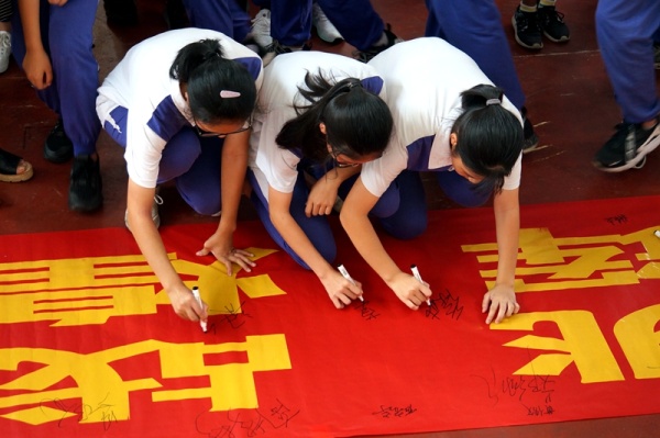 最后,全體初三同學在黃坤杰同學的帶領下,一起高舉右拳,大聲喊出:“理想學校,我們來了,加油,加油,加油!” 之后,初三學生代表和家長代表在“迎接人生挑戰(zhàn),中考再創(chuàng)輝煌”橫幅上簽名留念,接著全體初三師生帶著堅定的目標、飽滿的自信、堅強的意志也在橫幅上鄭重簽名,表達“中考必勝”的信心。