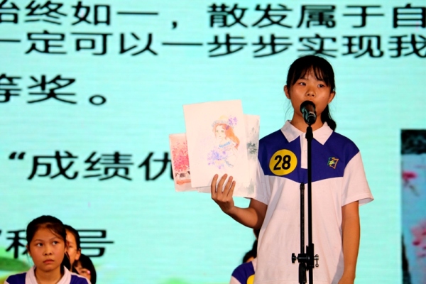 今天下午第八節(jié)課,初一、初二年級全體學生、學校全體行政、老師參加了投票活動。30名選手依次演講, 30個各具特色的ppt幻燈片展示成長軌跡、榮譽收獲。優(yōu)異的學習成績、豐富的班干經(jīng)驗、多彩的課外生活,無一不打動著現(xiàn)場的觀眾評委。初三(4)班劉思淇成績優(yōu)異、才華出眾,身為班干以身作則受到學生支持;初二(6)李穎怡多才多藝充滿正能量、樂觀親民,讓觀眾們忽略了小小個子的她;初一(1)班劉瑩迎用熱情激昂的話語,講述自己與班級的故事,讓同學們獲得長久的感動。臺上傾情演講,臺下熱情互動,絢爛的幻燈片背景,一段段個性展示更是引來了大家熱烈的歡呼。整個體育館內(nèi)掌聲雷動,洋溢著拼搏向上精神氛圍。