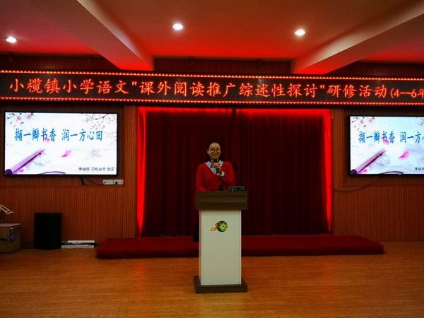 為了進一步深化教學改革,開拓課程意識,研究課外閱讀推廣的科學、有效的策略,以促進教師的專業(yè)成長,2018年12月21日上午,小欖鎮(zhèn)四至六年級語文教師聚集中山市菊城小學階梯室,參加小欖鎮(zhèn)小學語文教研組舉行的“課外閱讀推廣綜述性探討”研修活動?;顒佑山萄薪M毛小紅老師主持。