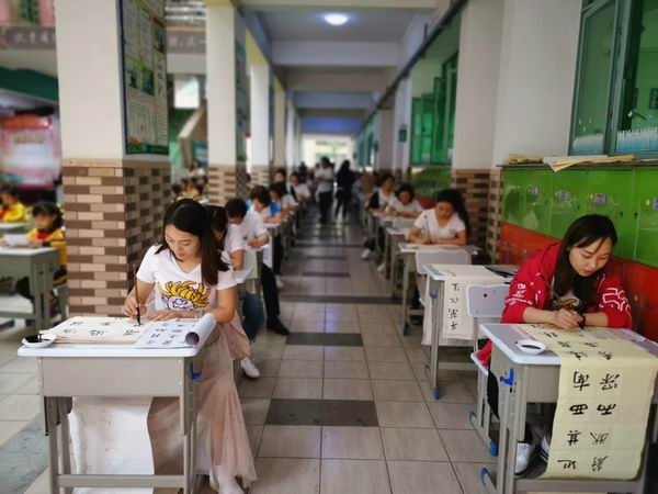 本次活動,菊城小學(xué)教師、學(xué)生、家長一起進行了現(xiàn)場書法展示。走進校園,首先引入眼簾的是那一個一個在空地上揮舞大筆,盡情書寫的孩子,他們年齡雖不大,但握著手中的大筆,寫出了新時代的口號,寫出了屬于自己和菊小的精彩!“蘭花有約”女子協(xié)會的每一位家長,平時齊心修身,花藝、書法樣樣得心應(yīng)手,在自己看書習(xí)字的同時,也給孩子們做了很好的樣榜。本次展示環(huán)節(jié),同學(xué)們書寫篆、隸、楷、行、草五體各所所長,均有展示。