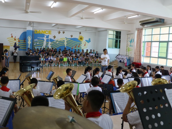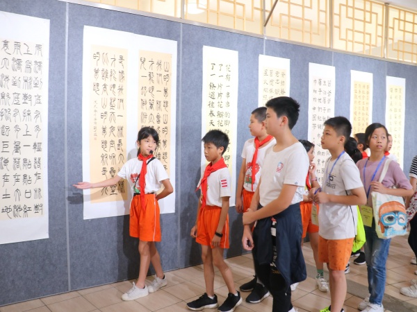 香港蔡衍濤小學(xué)的小朋友們一下車就受到了菊小同學(xué)的熱情歡迎。在學(xué)校少先隊的組織下,全體大隊委和來自四(1)、五(1)、六(1)三個國際英語特色中隊的同學(xué)分成8個小隊,一對一為香港的同學(xué)擔(dān)任“校園紅領(lǐng)巾導(dǎo)游”。大家首先帶著剛剛認(rèn)識的新朋友參觀了紅領(lǐng)巾書畫展,欣賞了“小雛菊”合唱團(tuán)和管樂團(tuán)的精彩表演??腿藗兗娂姙榫招〉纳鐖F(tuán)和隊員們鼓掌。