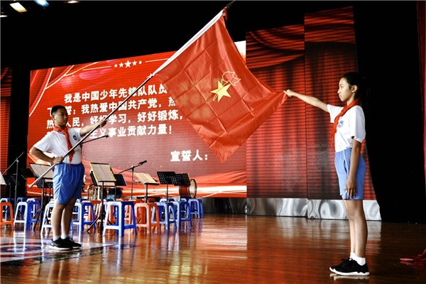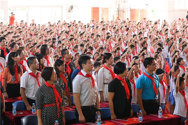 大隊輔導(dǎo)員洪智躍老師帶領(lǐng)全體隊員面向隊旗,莊嚴(yán)呼號:“準(zhǔn)備著,為共產(chǎn)主義事業(yè)而奮斗!”“時刻準(zhǔn)備著!”呼號聲響徹校園,表達了少先隊員們的遠(yuǎn)大理想和堅強決心?;顒釉谕似烨袌A滿結(jié)束。
