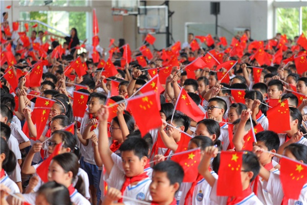 “五星紅旗迎風(fēng)飄揚,勝利歌聲多么響亮;歌唱我們親愛的祖國,從今走向繁榮富強……”雄壯的樂曲聲中,全場師生揮舞著手中的小國旗獻唱《歌唱祖國》,歌聲承載著理想和愿望,光榮而自豪,祝福祖國更加繁榮,更加富強!