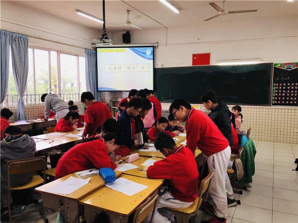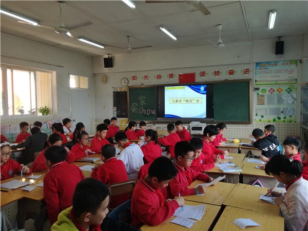 語(yǔ)文是一門實(shí)踐性很強(qiáng)的課程,作文教學(xué)一直是小學(xué)語(yǔ)文教學(xué)的難點(diǎn)。學(xué)生寫作能力是在實(shí)踐中形成的,缺乏寫作實(shí)踐支撐的習(xí)作教學(xué)注定是低效的。有鑒于此,小欖廣源學(xué)校省級(jí)課題《“快樂(lè)作文趕集會(huì)”語(yǔ)文活動(dòng)課程的開(kāi)發(fā)與實(shí)施研究》力圖改變學(xué)生作文交流少、讀者單一的問(wèn)題,以促進(jìn)學(xué)生作文交流和實(shí)踐為目標(biāo),開(kāi)展多元習(xí)作活動(dòng),培養(yǎng)學(xué)生創(chuàng)新精神和語(yǔ)文實(shí)踐能力。本周,五年級(jí)語(yǔ)文老師在各班開(kāi)展“快樂(lè)作文趕集會(huì)——兒童詩(shī)淘寶活動(dòng)”。