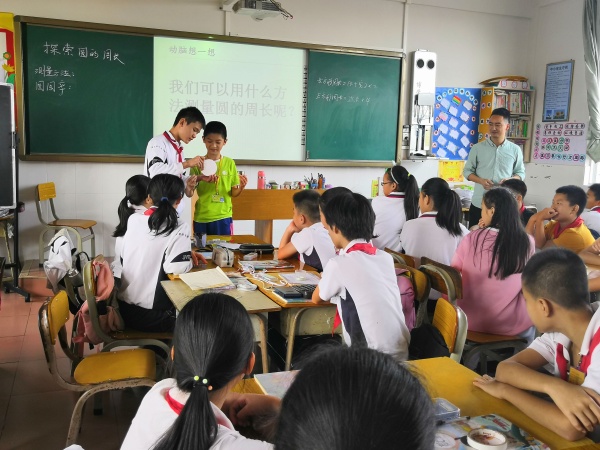 第三課由數(shù)學(xué)組兼職教研員胡誠老師帶來的一節(jié)趣味的《探索圓的周長》。胡老師通過活動(dòng)——推導(dǎo)公式——應(yīng)用公式來貫穿整節(jié)課。胡老師注重引導(dǎo)學(xué)生動(dòng)手實(shí)踐,在操作中理解知識(shí),發(fā)展思維。胡老師通過讓學(xué)生觸摸圓的周長,引發(fā)了如何求圓的周長問題,再通過實(shí)際操作測(cè)量讓學(xué)生明白可以通過“化曲為直”的方法求圓的周長,最后通過小組合作探究圓的周長與直徑的關(guān)系,推導(dǎo)出公式。在匯報(bào)交流中,羅美園副主任指出胡老師這節(jié)課課抓住了知識(shí)點(diǎn)的形成,學(xué)習(xí)方式多樣化,讓學(xué)生體會(huì)了數(shù)學(xué)來源于生活,服務(wù)于生活。