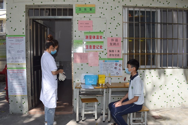 演練中,學(xué)生按照學(xué)校規(guī)定的上學(xué)時(shí)間、入校地點(diǎn),保持人與人之間1米以上的間隔,安靜有序進(jìn)入校園。學(xué)校設(shè)立體溫檢測(cè)點(diǎn)和臨時(shí)觀察區(qū),值班教師發(fā)現(xiàn)學(xué)生體溫異常后,將其帶到臨時(shí)觀察區(qū)進(jìn)行體溫復(fù)測(cè)及流行病學(xué)史篩查。再次確定學(xué)生體溫異常后,學(xué)校校醫(yī)、防控主管領(lǐng)導(dǎo)、班主任等相關(guān)人員按照上報(bào)處置流程,進(jìn)行處置與上報(bào)。
