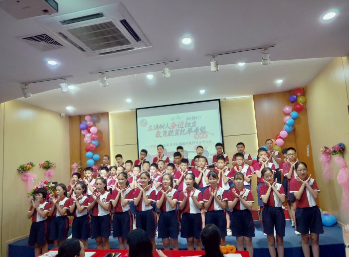 夜幕時分,華燈初上,聚星學校階梯室,處處洋溢著節(jié)日的氣氛。由七年級3班鐘欣怡同學和劉銦子老師主持的教師節(jié)表彰大會如期舉行。孩子們通過“演唱、詩歌朗誦、手語操表演、合唱”等形式,向老師們表達最真摯的謝意。路海云校長致辭,對辛勤工作的老師表達了真誠的問候和深深的祝福,勉勵老師們做新時代的四有教師,繼續(xù)全力以赴,再創(chuàng)佳績。會上,對2019--2020學年聚星學校榮獲市區(qū)優(yōu)秀的先進個人,聚星學校優(yōu)秀科組、優(yōu)秀教師、優(yōu)秀班主任進行了表彰。