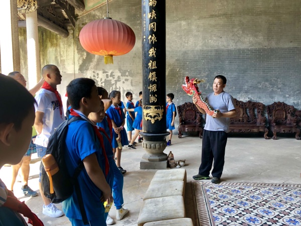 在隊旗的引領(lǐng)下隊員有序步行下一站——黃氏大宗祠。在第二站的參觀中,偶遇到了宗祠的管理員文叔,他也主動請纓為隊員和家長們做一次講解員。除了講解,隊員和家長們還現(xiàn)場觀看了一段即興醉龍表演!
