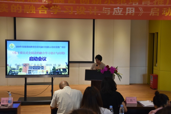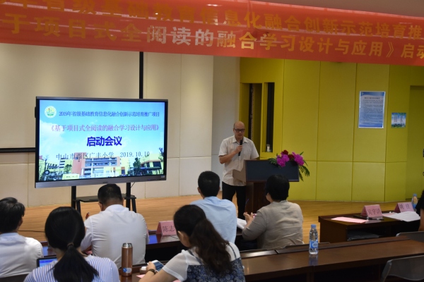 2019年10月10日,廣豐小學(xué)的報告廳里迎來了幾位專家,他們分別是中山市教育教學(xué)研究室梁雪菊老師,中山市教育信息中心吳宇清副主任、陳志豪部長,以及西區(qū)教育事務(wù)指導(dǎo)中心英語教研員姚佳老師。今天,他們將在這里和廣豐小學(xué)的校長、老師們一起為廣東省基礎(chǔ)教育信息化融合創(chuàng)新示范培育推廣項目之“基于項目式全閱讀的融合學(xué)習(xí)設(shè)計與應(yīng)用”項目開展項目啟動活動。